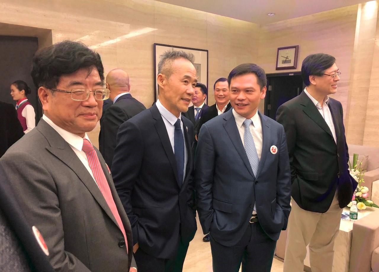 大会高峰论坛召开前,三诺集团董事长刘志雄与万科集团创始人、深商总会理事会主席王石,深商总会、深商联会长庄礼祥,联想集团董事长兼CEO杨元庆在贵宾室亲切交谈