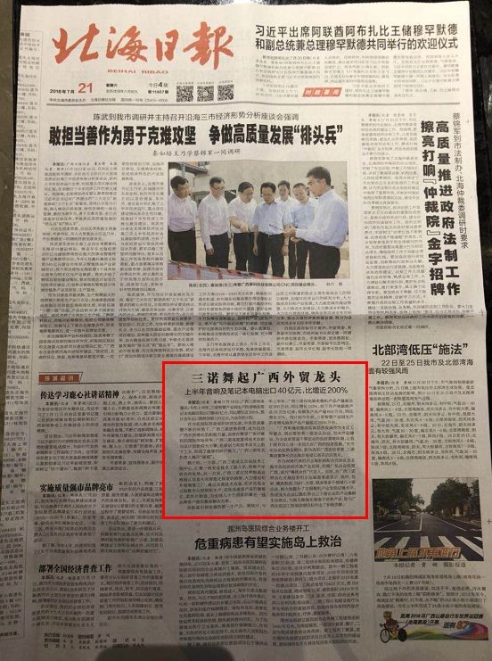 7月21日,《北海日报》头版重要位置刊登“广西三诺逆势倍增”新闻