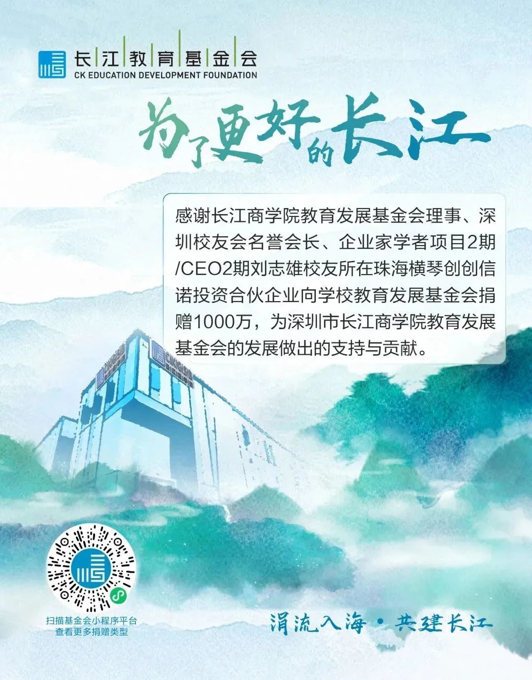 今年捐赠的1000万只是第一笔捐赠,我们希望不是通过简单的捐赠,而是探索一种“以商业模式做公益”的方式,践行长江一直倡导的商业向善文化,通过长江的生态、长江的资源,发挥长江校友“行业领袖,跨界精英”的天然优势,建设跨区域、跨项目、跨产业、互助互利的共赢生态,最终助力到学院和教育发展基金会的建设和发展。