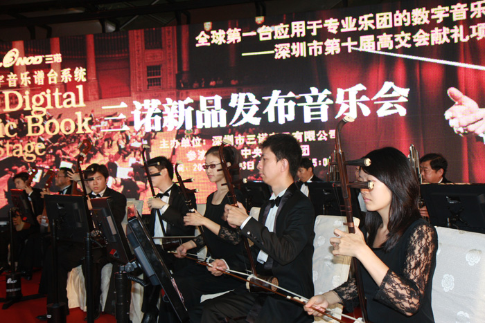 长期以来,作为演奏家和音乐工作者之基本工具的乐谱,乃然用靠传统的纸张,并未因为今天的科技的高速发展而带来改变;因为其自身的局限性,而给我们演奏家和音乐工作者带来了极大的不便……一向秉承科技以人为本、科技为人服务的三诺公司,为了弘扬民族音乐文化,打造中华创新技术和品牌,三诺公司投入了巨额资金,快速整合公司所有优势资源,进行数字音乐谱台系统的开发,同时联合作为中国皇家乐团的中央民族乐团进行产品实际应用的测试,并于今天在深圳——中国高新技术交易会上闪亮登场!这也真正实现了智慧、科技与艺术的完美结合!又一次在科技创新上实现了零的突破。