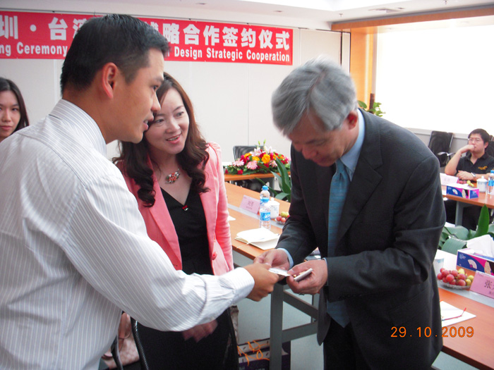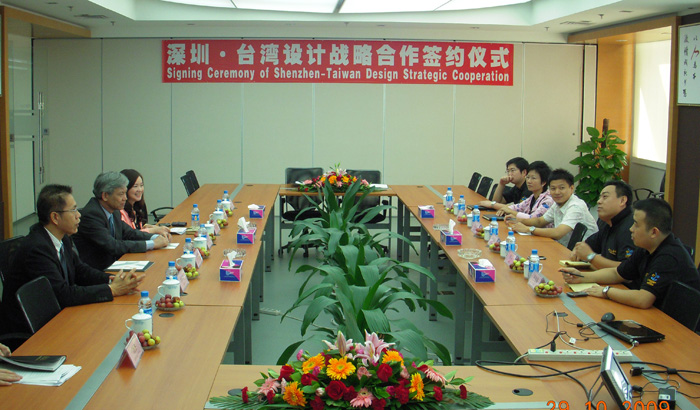 为了能够进一步密切两岸在设计领域的推广与合作,29日上午,在三诺集团办公总部,在众多创意设计界同仁的见证下,三诺集团董事长刘志雄作为深圳市工业设计行业协会会长代表深圳方与台湾创意文化中心执行长张光民共同签署了《深圳—台湾设计战略合作协议》。