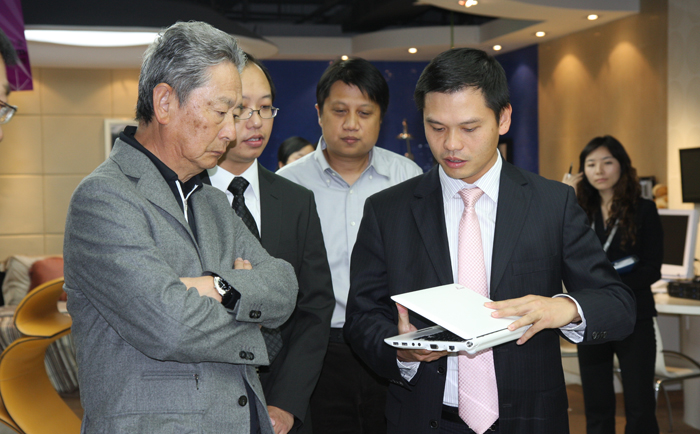 三诺董事长刘志雄向索尼前董事长出井伸之展示三诺推出的新产品
