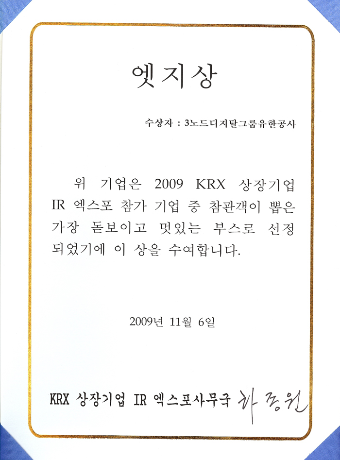 此企业是在2009年KRX上市企业IR Expo参加企业中,参观者选定的最引人注目的展位,因此授予此奖。