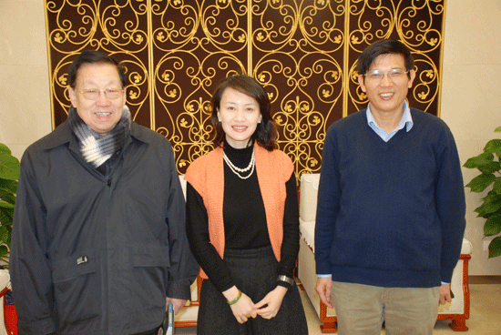李菲(中)与人民网副总裁官建文(右)及人民日报记者张友书(左)合影