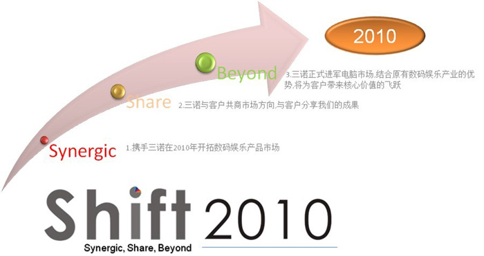 “Shift 2010” 代表了三诺将在2010年用我们的产品设计和市场策略为客户打开全新局面的信心和决心,合作(Synergic)、分享(Share)、超越(Beyond) 是三诺在新的一年对客户的“新三大承诺”。