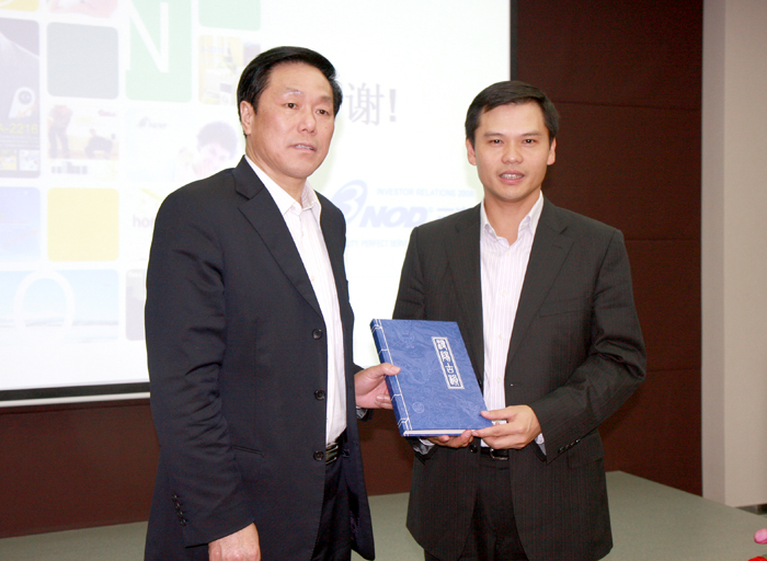 座谈会上,钟利贵书记详细询问了三诺陶瓷复金属路灯、HVLED高效路灯的技术研发情况,就三诺九江下一步产业拓展设想与我司领导进行了深入探讨与交流。会议结束后,钟利贵书记向刘志雄董事长赠送了介绍九江风土人情的《浔阳古韵》精美邮册,并合影留恋。