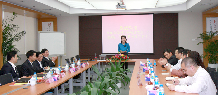 九江市市委书记钟利贵一行听取李菲副总裁对三诺的企业文化及经营发展情况的介绍