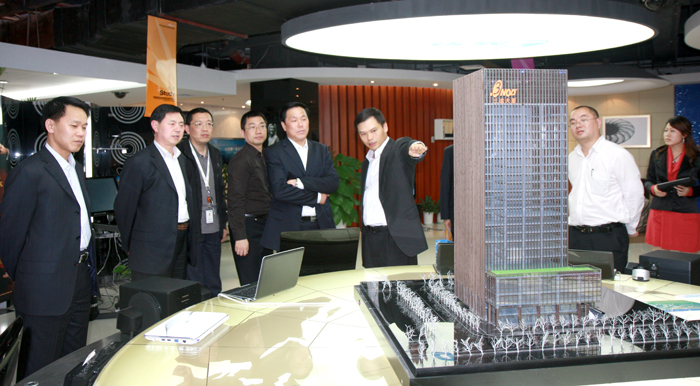 九江市市委书记钟利贵认真聆听刘志雄董事长介绍三诺大厦的建设规划