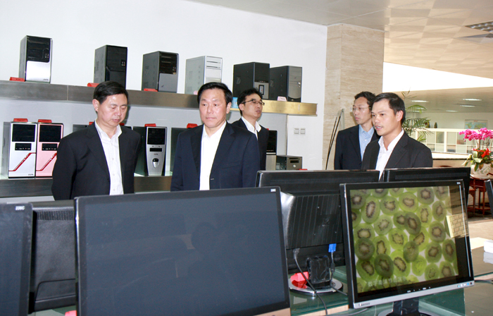 在我司领导的陪同下,钟利贵书记一行首先来到三诺技展,参观生产车间,了解生产情况。在技展产品展示厅,钟书记认真聆听了刘志雄董事长对技展电脑机箱、数码显示器等IT外设产品的详细介绍,对技展高科技含量的产品给予了极大肯定和赞许。