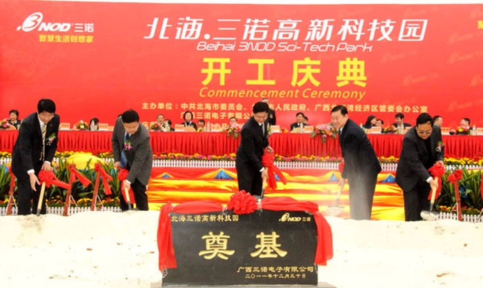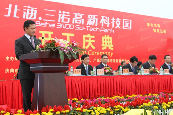 北海三诺高新科技园是广西壮族自治区与北海市两级政府推进的重大电子信息产业项目。2011年5月14日, 广西自治区主席马飚亲自率领自治区有关部门和北海市领导赴三诺集团深圳总部考察指导,现场办公,短短15日内,今年5月28日,在马飙主席的亲自见证下,北海三诺项目顺利签约,庆典仪式上,马飚主席又专门发来贺信,对北海三诺高新科技园的开工建设表示祝贺。广西自治区人民政府副秘书长魏然宣读了贺信。广西自治区有关单位领导、中直驻桂有关单位领导,北海市辖县区和北海市直部门领导,北海工业园区管委会全体干部职工、三诺供应商伙伴及嘉宾等共600多人出席开工庆典仪式。