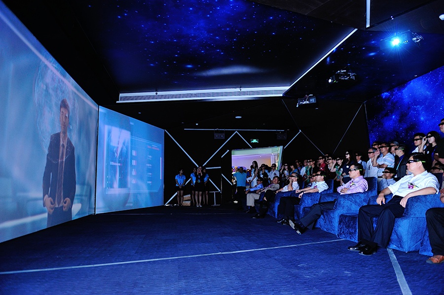 嘉宾在智慧3D数字影音体验馆体验震撼的未来生活创想大片