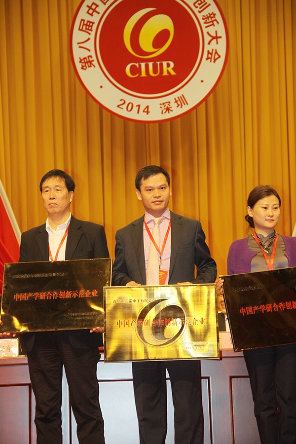 三诺获得由路甬祥会长亲自颁发的《中国产学研合作创新示范企业》奖,深圳企业只有三家获此殊荣