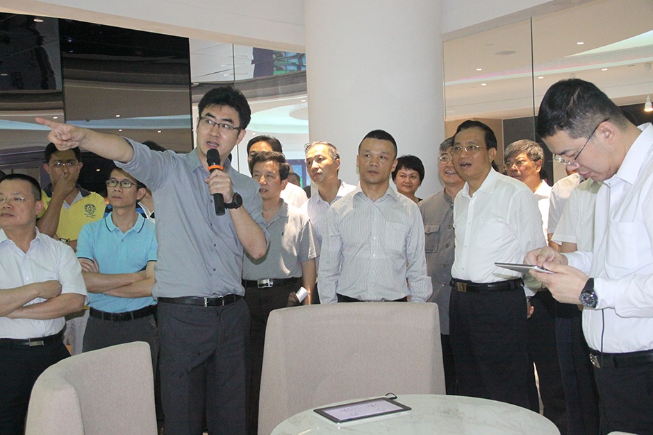 三诺集团副总裁刘志强、蓝筹科技总经理乔峤陪同陈市长一行参观智慧生活创想馆未来教室,对三诺开发的智慧教育平板赞赏有加。