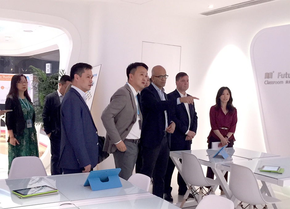 11月2日,微软CEO萨提亚?纳德拉一行(微软公司资深副总裁、微软大中华区董事长兼首席执行官柯睿杰,副总裁Peter Han,CEO办公室公关主管Caitlin McCabe,ODM销售团队总监 Cindy Wu)在集团董事长刘志雄的陪同下参观了由深圳市科创委和三诺集团联手打造的深圳智慧生活创想馆。