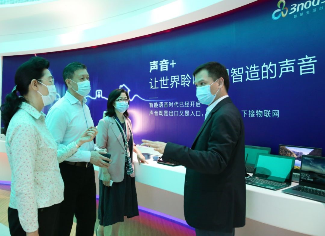 刘志雄董事长(右一)向林洁书记(左一)介绍三诺“声音++”产业链