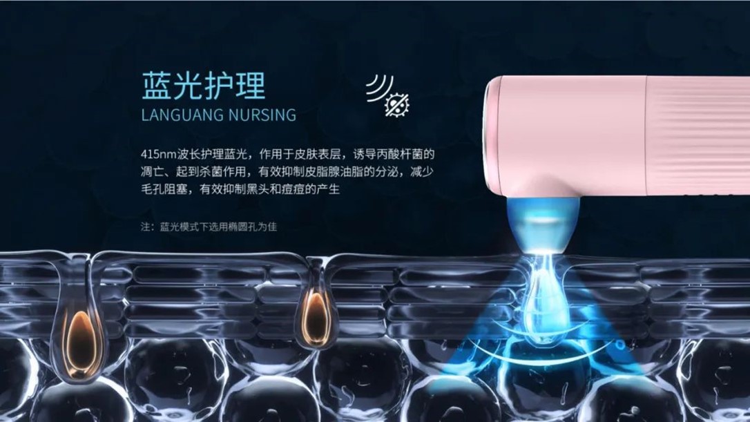 蓝光护理:415nm波长护理蓝光,作用于皮肤表层,诱导丙酸杆菌的凋亡、起到杀菌作用,有效抑制皮脂腺油脂的分泌,减少毛孔阻塞,抑制黑头和痘痘的生长