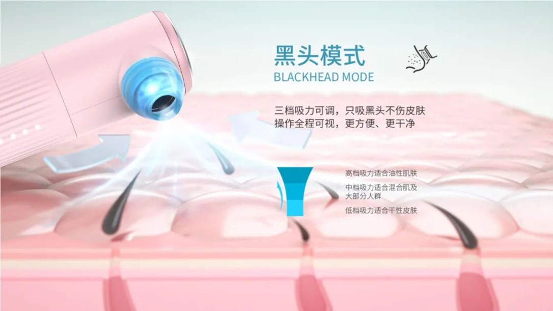 黑头模式:真空负压、清洁彻底,高中低三挡吸力可调,只吸黑头不伤皮肤,操作全程可视,更方面、更干净