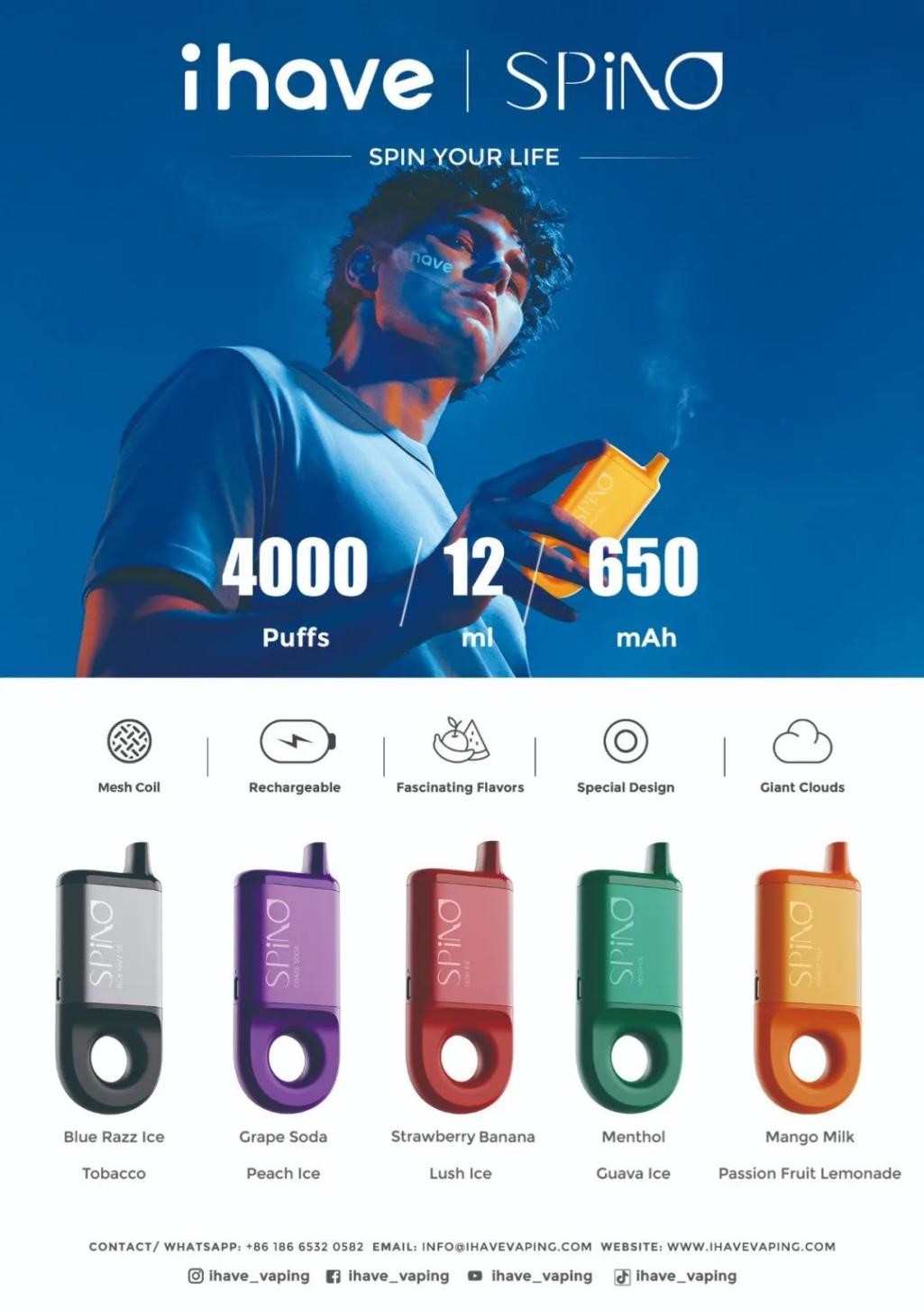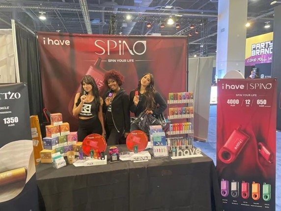 展会上,ihave电子烟推出了一款新产品——SPINO,4000-6000大口的SPINO有12-14毫升的电子液体、5%的尼古丁和650毫安时的内置网状线圈充电电池。它最大的特点是底部的圆环,独特的美学设计将用户体验最大化,相比于市面上常见的电子烟机型,SPINO的设计结合了人体工学及美学设计,以圆滑、可玩性为设计灵感,使用户在使用电子烟的同时,感受在手上把玩的乐趣。SPINO有五种美妙的颜色和10种迷人的口味,从水果味到经典原味,包括草莓、香蕉、百香果、柠檬等等。