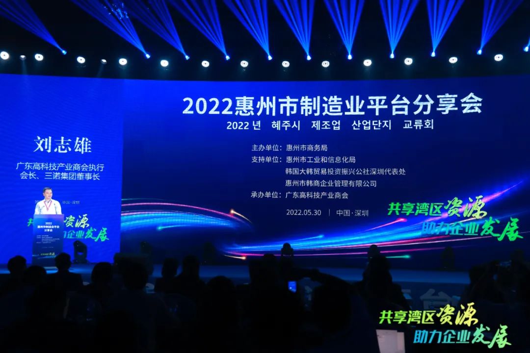 5月30日,由惠州市商务局主办、广东高科技产业商会承办的“共享湾区资源 助力企业发展”2022惠州市制造业平台分享会在深圳举行。惠州市委常委、副市长赵则永,广东高科技产业商会执行会长、三诺集团董事长刘志雄出席并致辞。惠州市商务局、工信局领导及区县相关负责人,优质高新技术企业、“专精特新”企业及初创型科技企业近150人出席活动。