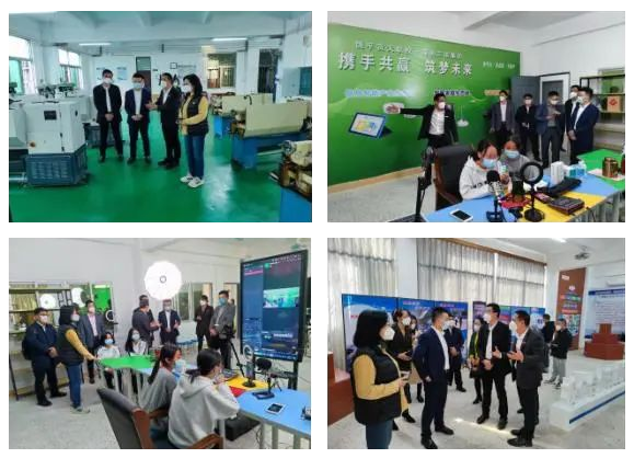 刘志强一行在饶平县教育局、贡天职校有关人员的陪同下,参观了电工、电子工艺、单片机、PLC、数控车床、钳工等学校产教融合实践基地的实训场室,观摩学生直播三诺智慧产品的实训教学活动。双方就校企合作专业课程设置、学生实训设备提升等实际问题进行深度研讨。