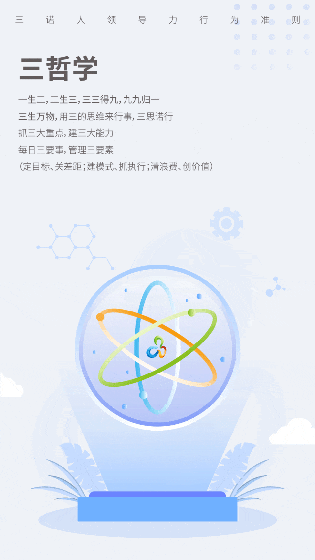 一生二,二生三,三三得九,九九归一。三生万物,用三的思维来行事,三思诺行。抓三大重点,建三大能力,每日三要事,管理三要素(定目标、关差距;建模式、抓执行;清浪费、创价值)。