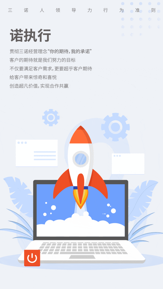 贯彻三诺经营理念“你的期待,我的承诺”,客户的期待就是我们努力的目标,不仅要满足客户需求,更要超乎客户期待,给客户带来惊奇和喜悦,创造超凡价值,实现合作共赢;一言九鼎、一诺千金;知行合一、崇尚行动、快速反应,以行促知;言必行,行必果;说到做到,一次做对;把理想变成现实,把目标变成结果。