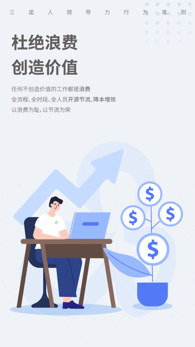 3、形成“清浪费、创价值”的绩效体系和文化,杜绝浪费,以浪费为耻,以节流为荣,鼓励所有人及团队在每个岗位与工作环节、为“清浪费、创价值”建言和行动。