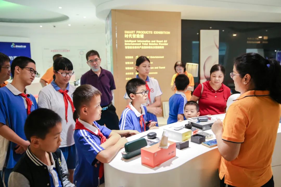 “设计引领生活、智慧改变生活”,走进三诺智慧大厦1800m^2的深圳智慧生活创想馆展厅,在专业讲解员绘声绘色的讲解下,三诺的孩子们开启了感知智慧生活的穿越之旅。大家在兴致勃勃地体验了由爸爸妈妈亲手打造的一件件AI智能屏音箱、智能支付、智能穿戴、智慧终端、智慧教育等场景化智能产品和健康防护产品,领略了三诺围绕“智慧家庭、智慧工作、智慧出行、智慧教育”四个场景的未来家庭智慧生活方式之后,不由得个个树起大拇指,为爸爸妈妈的工作成果点赞!